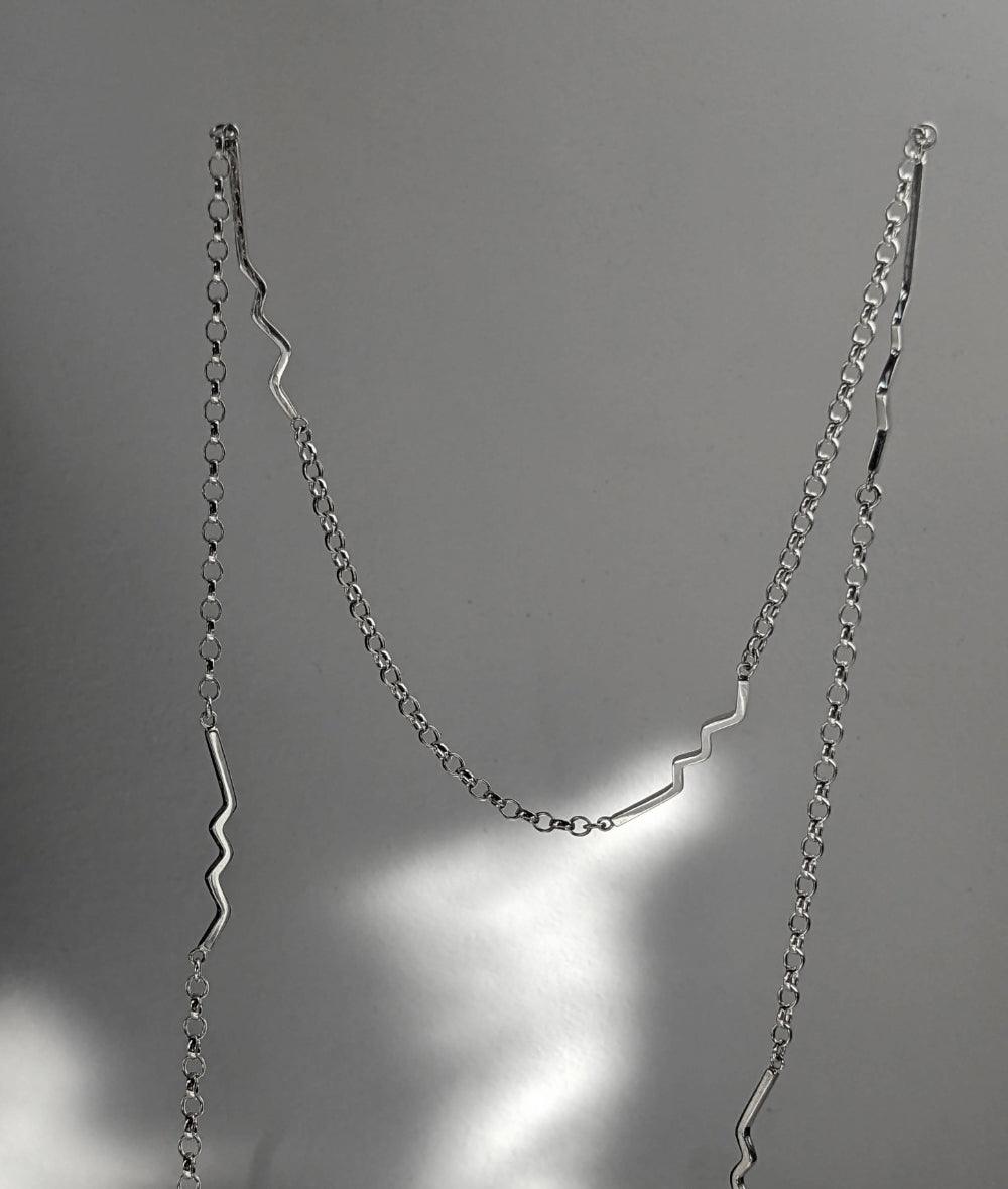 Each charm is hand carved in wax before being re-created to be lost wax cast in eco silver. Zigzag links and loops are hand forged with a hammer before being hand assembled to create this lariat necklace. Highly polished to a bright shine, creating an elegant necklace for special occasions.