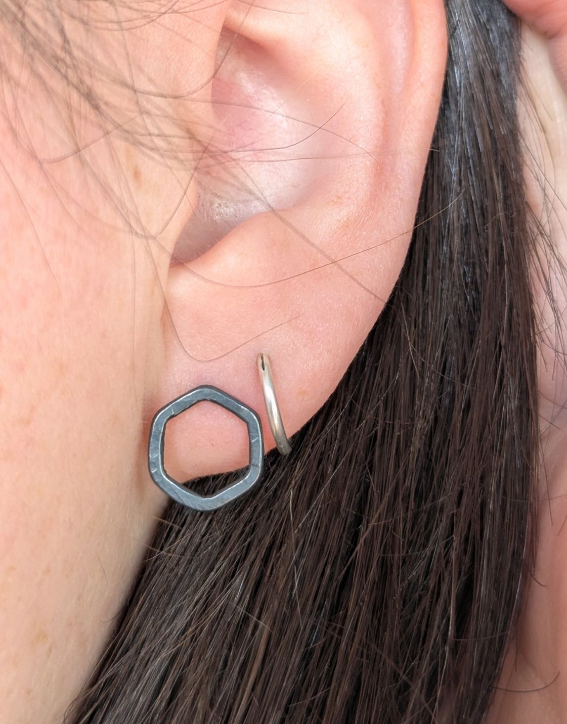 These simple and minimal studs are created from silver wire, individually formed into hexagons and textured using a hammer, making each one entirely individual. These earrings are then hand-assembled before being polished. You can even choose to have an oxidised (black) finish too which reflects the colour of the basalt columns further.